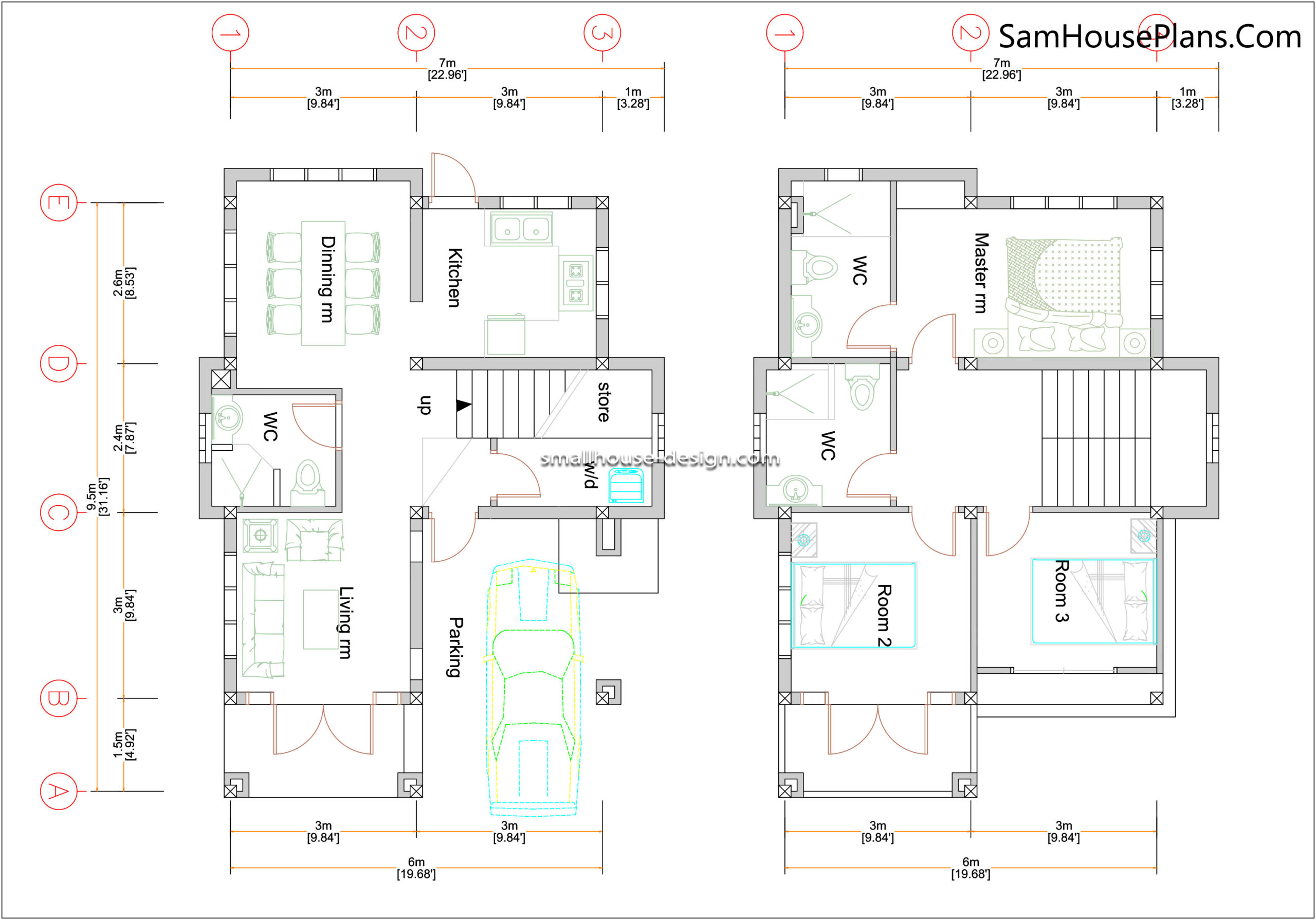 House Plan Drawing 6×10 Meters 20×33 Feet 2 Beds