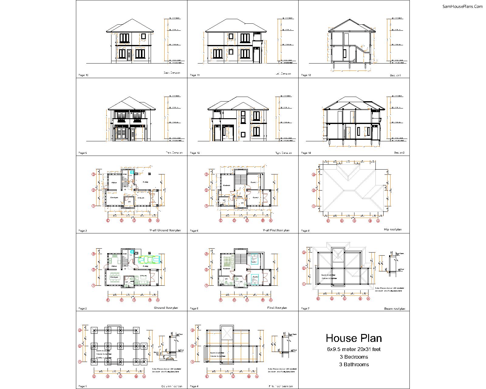 20×31 Small House Plan 3 Bedrooms Hip Roof 6×9.5 Meter