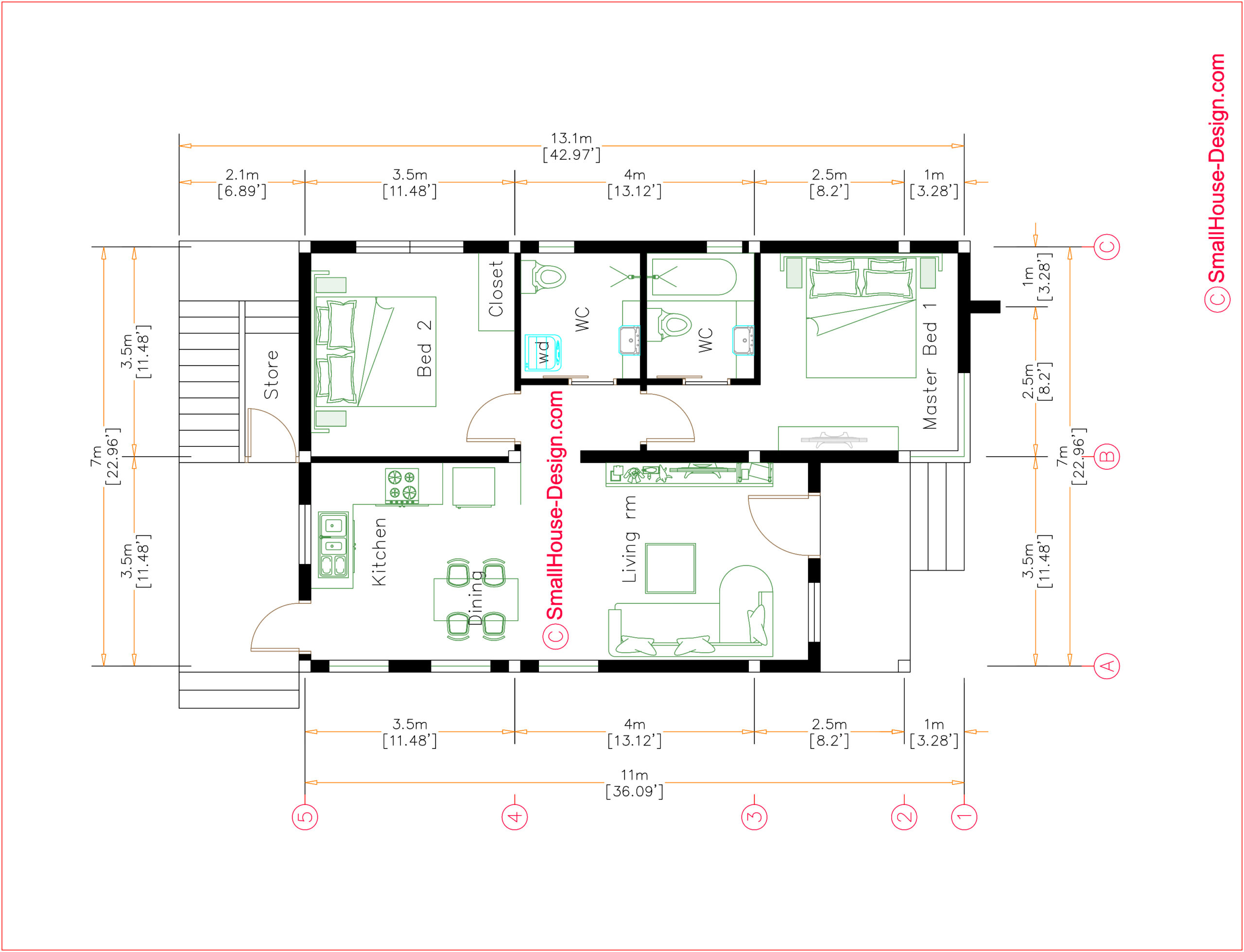 Small Plans 7×7 Meter 23×23 Feet One Bed