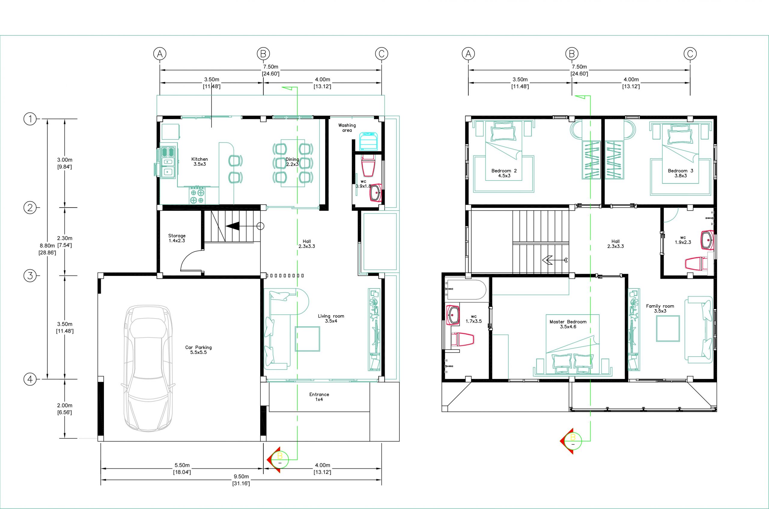 At first floor: the Master Bedroom size is 3.5×4.6 meters attached with bathroom 1.7×3.5 meters, it also has a big glass window with a queen size bed, Makeup desk and closet. Bedroom 2 size 4.5×3 meters, and bedroom 3 size is 3.8×3 meter. Family room 3.5×3 meter with balcony.